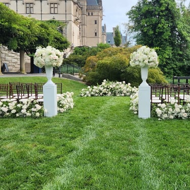 (Aisle runner, silk floral for arch, candles, grass or draped backdrop & welcome sign with silk floral arrangement.)